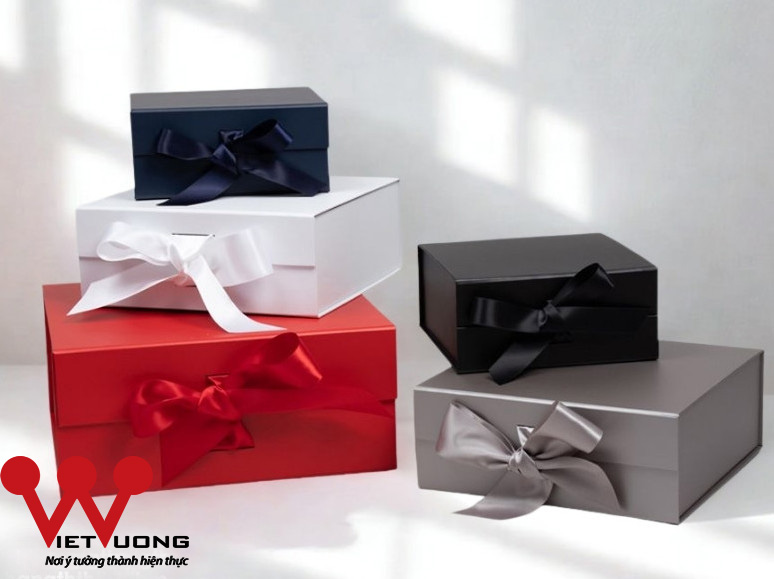 Hộp quà tặng cao cấp sẽ sử dụng các chất liệu như carton lạnh và giấy mỹ thuật. Đặc điểm này giúp 02 mẫu hộp bìa cứng cao cấp có khả năng in ấn logo và hoa văn tinh tế trên bề mặt.